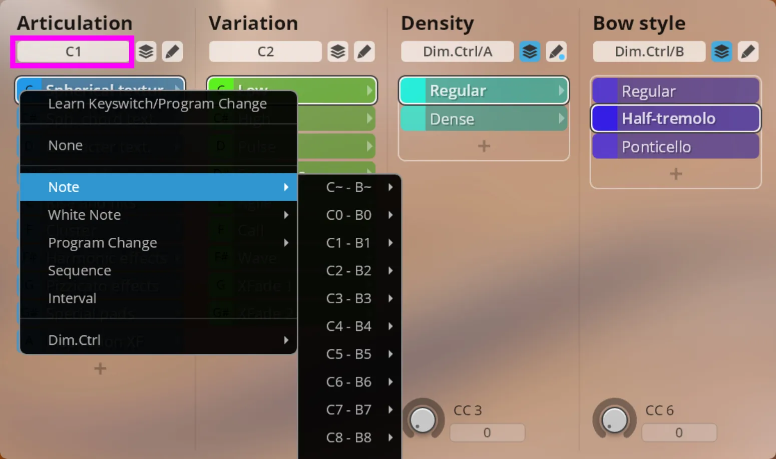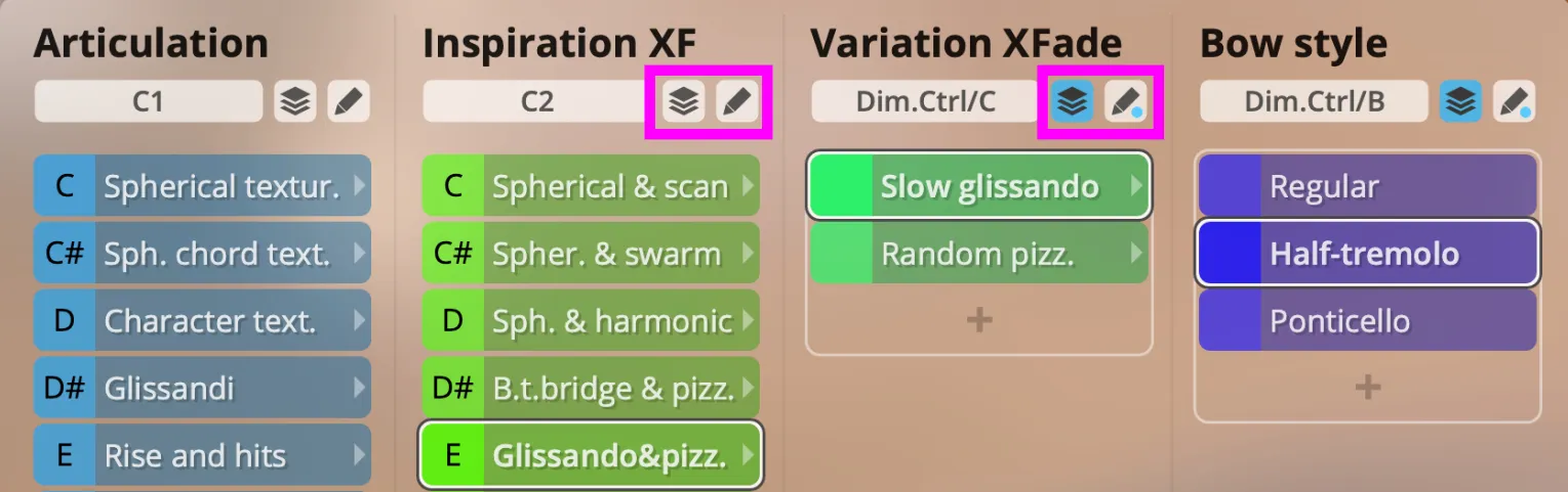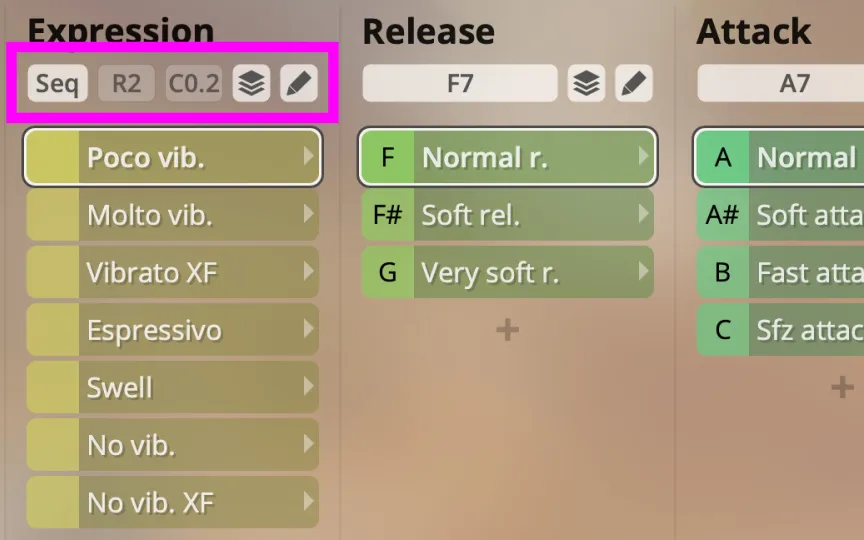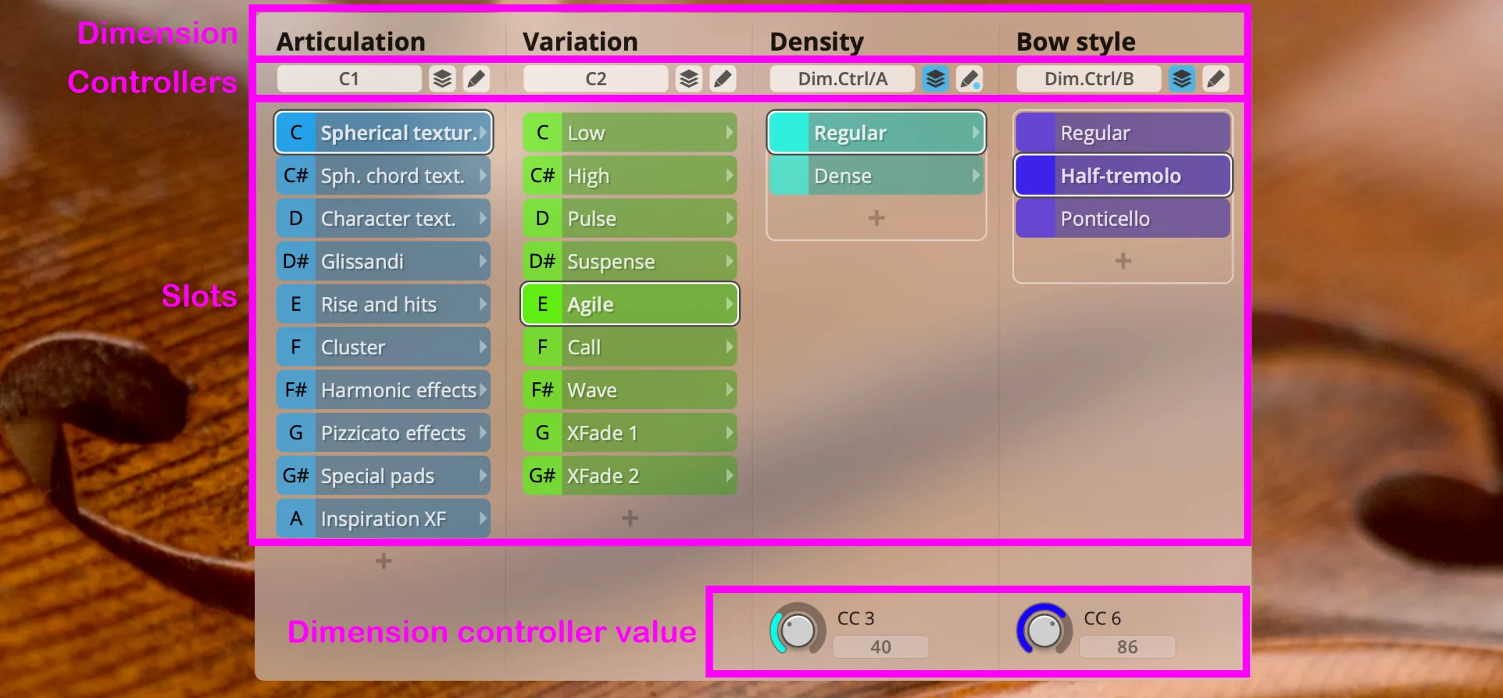 디멘션 트리 뷰는 Synchron Player의 중심 화면입임. 세로 한 줄이 하나의 디멘션이며, 각 디멘션에는 여러 슬롯이 들어 있고, 흰 테두리는 현재 선택된 슬롯임. 각 디멘션에서 선택된 슬롯을 왼쪽부터 차례로 보면, 지금 어떤 아티큘레이션 조합을 쓰고 있는지 알 수 있음.