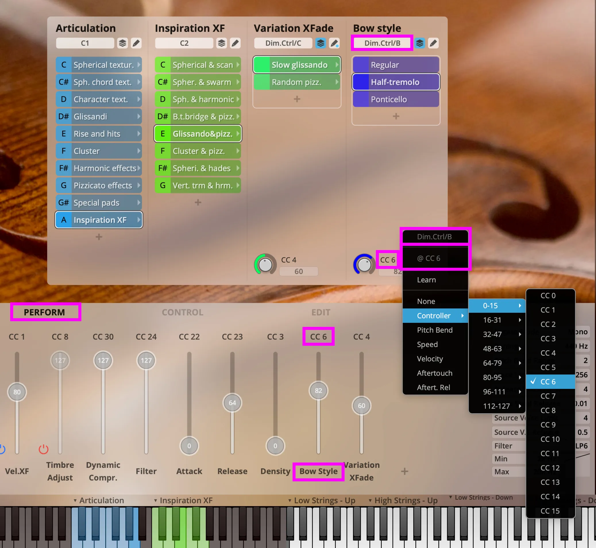 이렇게 연결해 둔 컨트롤들은 PERFORM 탭에서도 한번에 확인할 수 있음. 트리 뷰 아래쪽을 보면 목록이 표시되고, 거기서 각 컨트롤러의 커브도 추가로 직접 만질 수 있음.